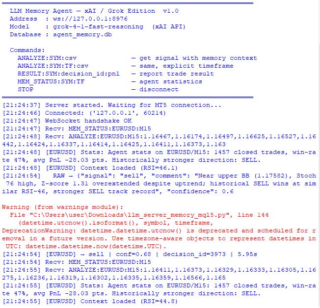 MetaTrader 5 (EA_Memory_Agent.mq5) │ ├─ ANALYZE:SYMBOL:csv ────────────────────────────┐ │ │ ├─ RESULT:SYMBOL:signal:pnl ──────────────────┐ │ │ WebSocket │ │ │ Python—сервер (llm_server_memory.py) │ │ │ │ │ ├─ MemoryLayer (SQLite) │ │ │ ├─ write_decision() ◄─────────────────────┘ │ │ ├─ get_context() → релевантный фрагмент │ │ └─ get_stats() → точность по инструменту │ │ │ ├─ build_prompt(context, stats) ──────────────┐ │ │ │ │ └─ Grok (xAI API) ◄──────────────────────────┘ │ {"signal","comment","confidence"} ────────────┘