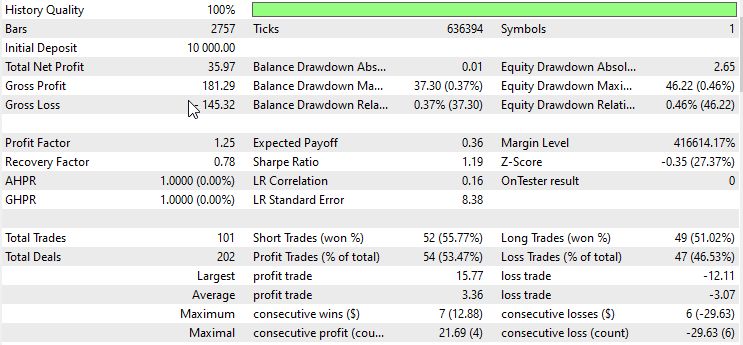 За тестовый период советник совершил 101 сделку: 52 коротких (55.77% прибыльных) и 49 длинных (51.02% прибыльных). Общий процент прибыльных сделок — 53.47% (54 из 101), убыточных — 46.53% (47 из 101).