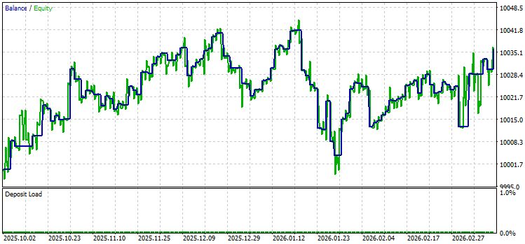 Просадки минимальны: максимальная просадка по балансу — $37.30 (0.37%), по эквити — $46.22 (0.46%). Фактор восстановления — 0.78, коэффициент Шарпа — 1.19. Z-Score составил −0.35 (27.37%), что указывает на отсутствие статистически значимой серийной зависимости между выигрышами и проигрышами.
