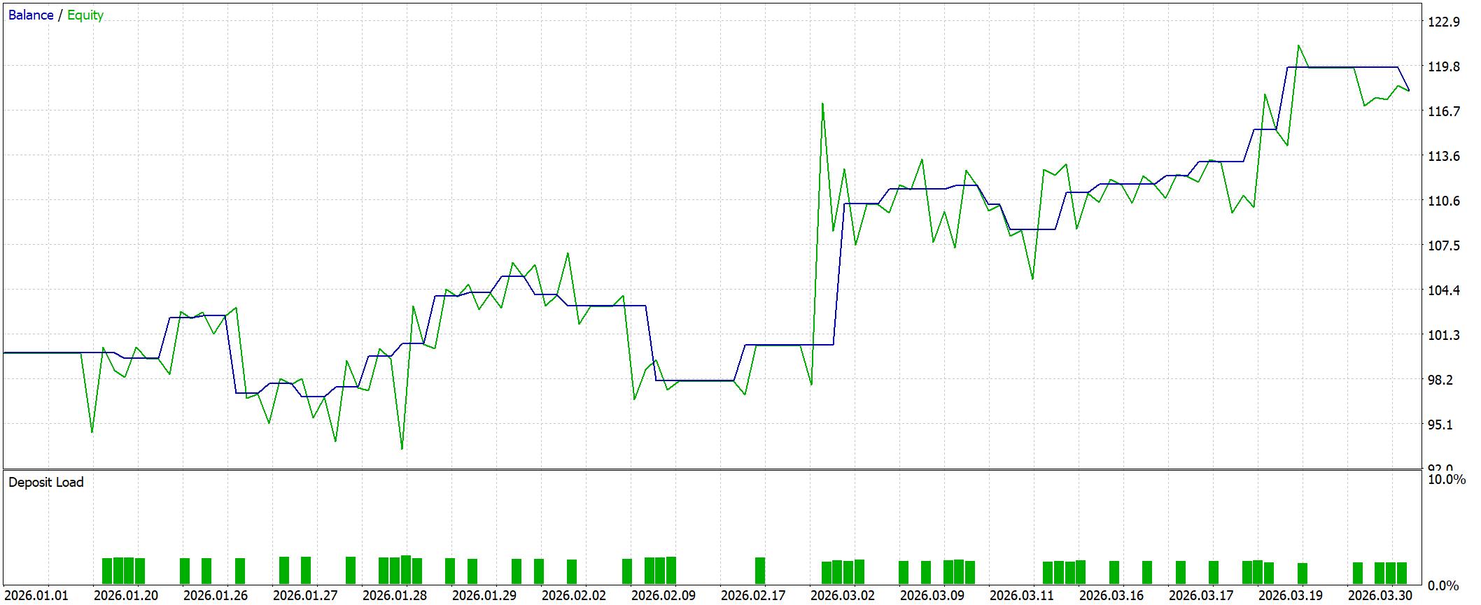 Полученный советник далее проходит ключевую проверку — тестирование в тестере стратегий MetaTrader 5 на исторических данных за первый квартал 2026 года. Это уже не абстрактная оценка модели, а приближенный к реальности сценарий исполнения.