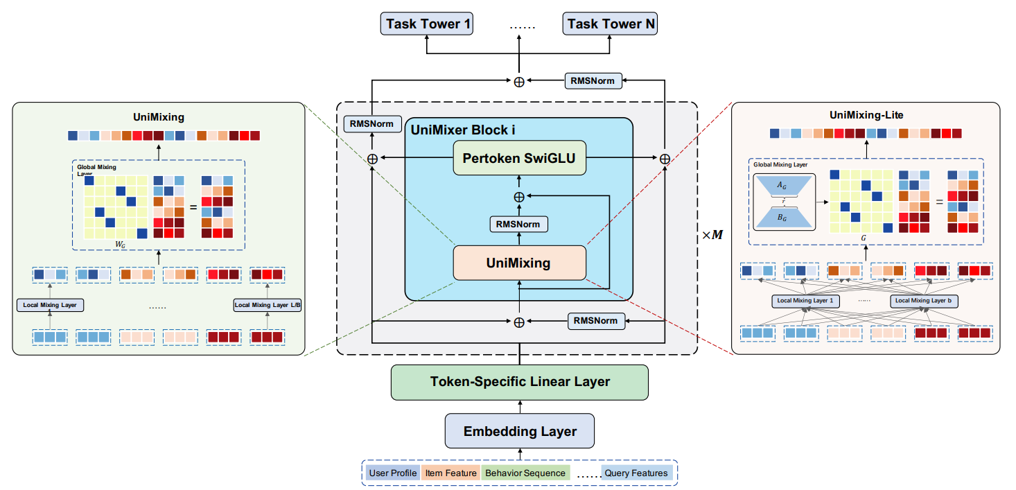 На этом фоне всё больше внимания привлекают архитектурные решения, которые работают иначе. Они не зацикливаются на времени как на главной оси, а пытаются моделировать взаимодействие признаков. Одной из таких архитектур является фреймворк UniMixer, представленный в работе "UniMixer: A Unified Architecture for Scaling Laws in Recommendation Systems". Его идея достаточно прагматична: не выбирать между механизмами внимания, MLP или моделями факторизации, а рассматривать их как разные способы одного и того же процесса — смешивания признаков. И уже внутри модели комбинировать эти способы в зависимости от решаемой задачи.