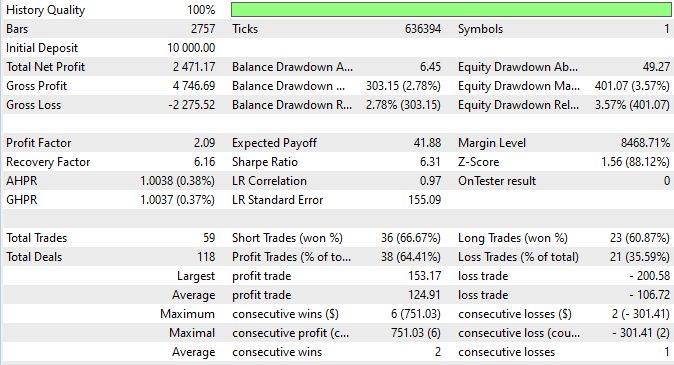 За восемь недель система совершила 59 сделок и заработала $2 471 при депозите $10 000. Profit Factor 2.09 — это означает, что на каждый потерянный доллар система приносила два. Это сильный показатель.