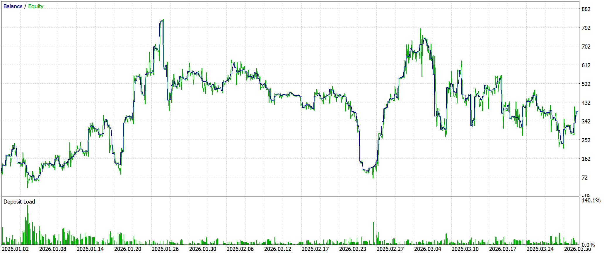 Тестирование на исторических данных показало умеренно положительный, но нестабильный результат. При стартовом депозите 100.0USD итоговая прибыль составила 288.64USD. Однако качество этого роста остаётся слабым: Profit Factor равен 1.08, что указывает на минимальный статистический перевес системы. Количество сделок (340) с практически равным распределением прибыльных и убыточных позиций подтверждает, что преимущество формируется не за счёт высокой точности прогнозов, а за счёт небольшого смещения математического ожидания в сторону прибыли.