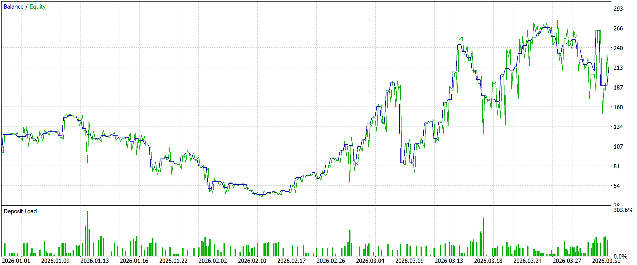 Тестирование показало противоречивый, но показательный результат. С одной стороны, стратегия вышла в плюс: при стартовом депозите $100.0 итоговый баланс составил около $210.05, то есть модель действительно извлекает прибыль из рыночного потока. Однако эта прибыль формируется через высокую турбулентность результата.