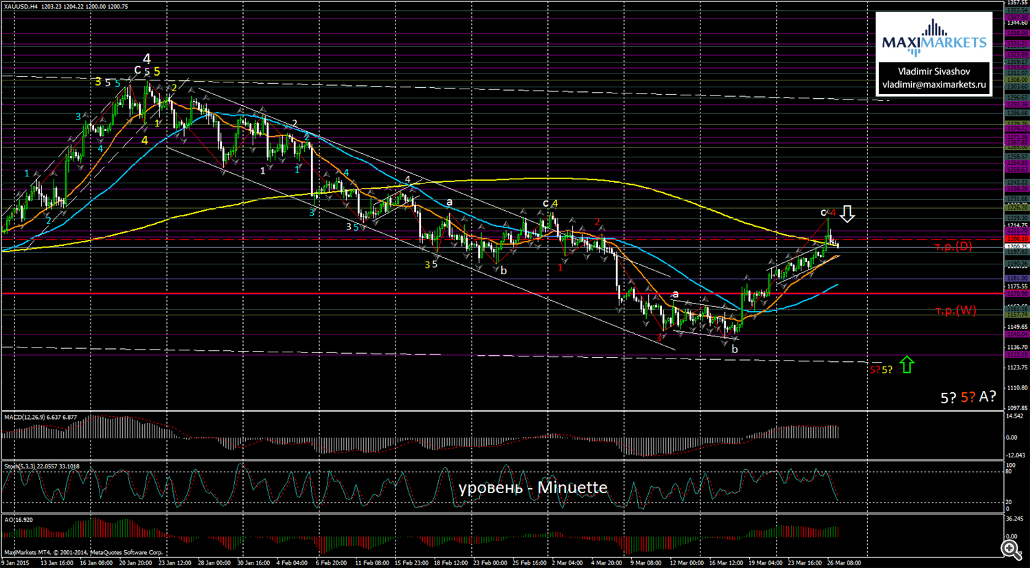 Все последние дни товарно-сырьевой рынок продолжает наращивать позиции в золоте и серебре. Уже на утренних торгах в четверг «быкам» удалось развернуть котировки металла и от уровня 1194.35$ пробить максимальный уровень предыдущего дня 1200$ за унцию и в стремительном ралли сформировать новую вершину подъема 1219.63$ за унцию. Драйверами позитивной динамики металлов стали сразу несколько факторов, определивших позитивный для золота настрой рынка. Основную поддержку восходящему движению золота оказал переход ФРС США к более сдержанному курсу монетарной политики, а также снижение ожиданий рынка относительно сроков повышения процентной ставки на доллар. Причем, чем больше негативной статистики из США появляется на рынке, тем выше потенциал дальнейшего роста стоимости металлов. Кроме того, приближается серия весенних фестивалей в Индии (апрель 2015), сопровождающихся традиционными подарками изделий из драгоценных металлов. Инвесторы в этой связи ждут существенное увеличение спроса на золото и серебро. И, наконец, увеличение геополитической напряженности на Ближнем Востоке после начала международной военной операции коалиции стран Персидского залива против шиитских боевиков в Йемене также усилили перевод инвестиций в золото, выступающего в данном случае в качестве актива зоны безопасности. Тем не менее, достигнув на подъеме 4-х недельного максимума, «быки» начали фиксировать прибыль и закрывать сделки на покупку металлов. В результате рост золота остановился, а его ценовая динамика, сформировав на вершине 4-х часового таймфрейма характерную разворотную свечу «Падающая звезда», развернулась на коррекционное снижение. На исходе дня «медведям» удалось восстановить часть предыдущих потерь и завершить торговую сессию четверга на ценовом уровне 1203.36$ за унцию.