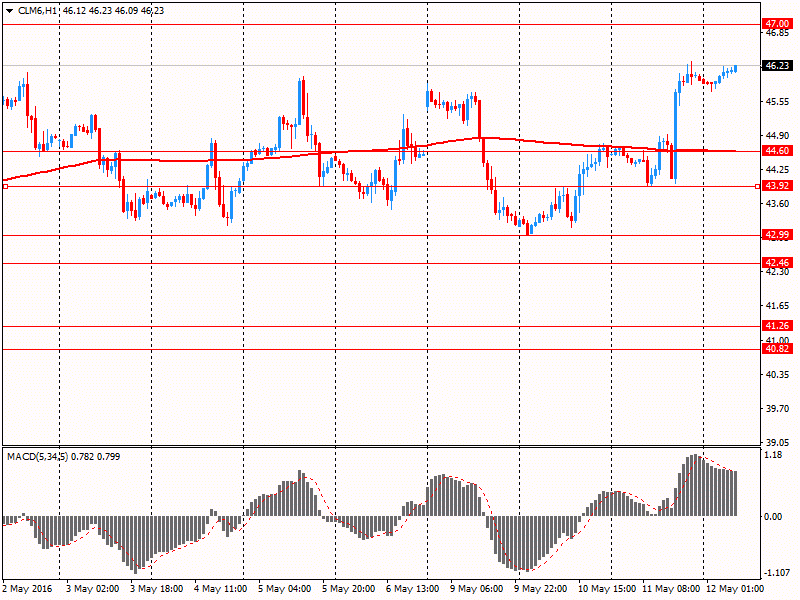 Фьючерсы на нефть сорта WTI демонстрируют негативную динамику. На текущий момент июньские фьючерсы котируются по $46.17 за баррель (-0.13%). Цены на нефть незначительно снижаются, корректируясь после значительного повышения накануне, которое было вызвано американской статистикой по запасам нефтепродуктов. Отчет Минэнерго США показал, что на неделе 30 апреля - 6 мая запасы сырой нефти упали на 3,4 млн баррелей, до 540 млн баррелей. Аналитики в среднем ожидали повышение на 0,5 млн. баррелей. "Многие думают, что вчерашний скачок цен был чрезмерным, поэтому они решили взять прибыль сегодня утром, пока это возможно", - отметил один из нефтетрейдеров. Кроме того, негативной динамике способствует постепенное восстановление канадского производства.
