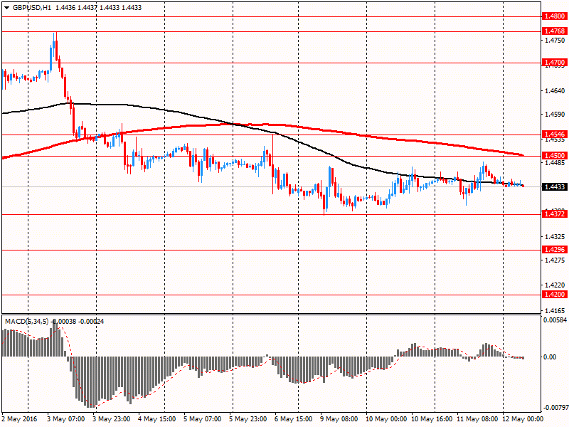 Пара GBP/USD консолидируется вблизи уровня открытия сессии в ожидании оглашения итогов заседания ЦБ Англии. Экономисты будут внимательно следить за тем, сохранится единство мнений среди руководства ЦБ после увеличения понижательных рисков для роста ВВП. В минувшие выходные издание Guardian сообщило, что как минимум один из членов комитета ЦБ может выступить за снижение процентной ставки для стимулирования экономики. Влияние на фунт также будет оказывать изменение тяги к риску, а также новости, связанные с "Брекзитом". Итоги опроса Reuters указали, что экономический рост Британии должен быть медленным и устойчивым в будущем году, но если страна проголосует за выход из ЕС или активизируются опасения по поводу мировой экономики, риски для экономики усилятся. Подавляющее большинство из 60 экономистов, опрошенных на этой неделе, сказали, что голосование по вопросу выхода Великобритания из ЕС и глобальная экономическая неопределенность - это два самых больших рисков для экономического роста. Также опрос показал, что если британцы все-таки решат остаться членом блока, экономика будет расти на 0,4-0,5 процента во всех, кроме одного, кварталах до сентября 2017 года. Ни один из опрошенных экономистов не ожидает, что ужесточение политики ЦБ состоится до октября 2016 года. В среднем, эксперты прогнозируют, что ставка не будет повышаться до начала следующего года. Важное сопротивление - $1.4546 (максимум 6 мая). Важная поддержка - $1.4296 (минимум 21 апреля).
