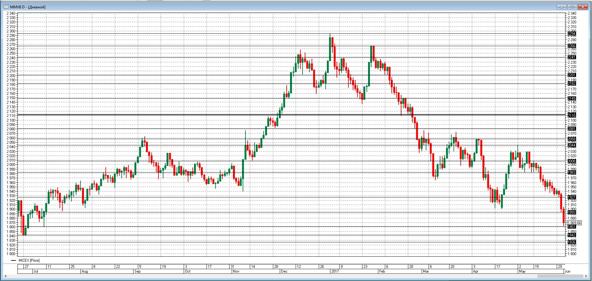На торгах 01/06/17, индекс ММВБ пробил зону поддержки на 1882-1887. День закрылся на отметке 1870. Ближайшее сопротивление находится на 1879; следующее сопротивление расположено на 1893. Ближайшая зона поддержки находится на 1861-1863; следующая поддержка расположена на 1842.