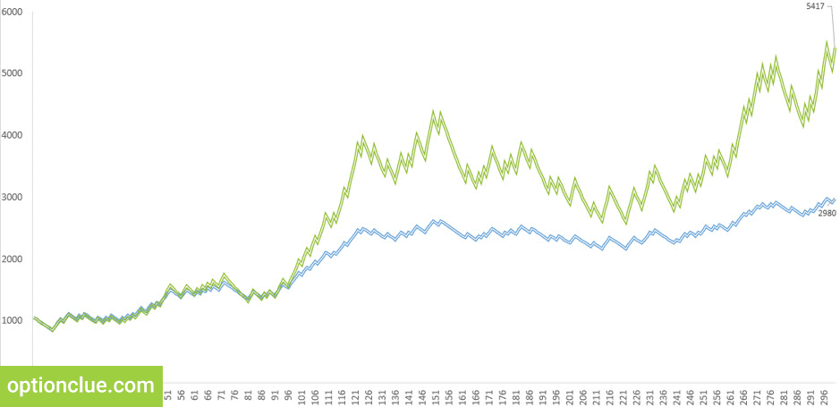 В данном примере риск на сделку велик (5% риска на сделку — крайне агрессивная торговля), что отражается на потенциале прибыли (+10% в каждой положительной сделке). По большому счету зеленый график отражает доходность с реинвестированием полученной прибыли, а синий — без реинвестирования.