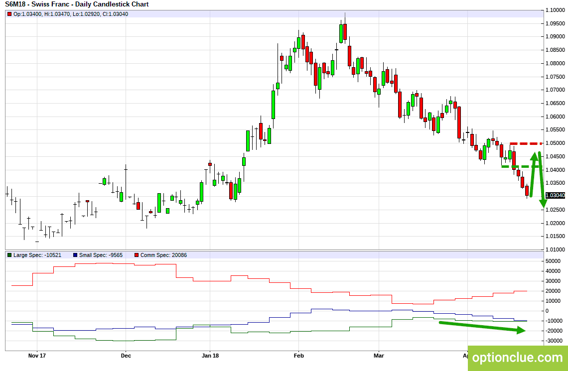 Индикатор COT снижается, крупные спекулянты продают франк, мнение профессионалов сочетается с направлением тренда на Daily.
