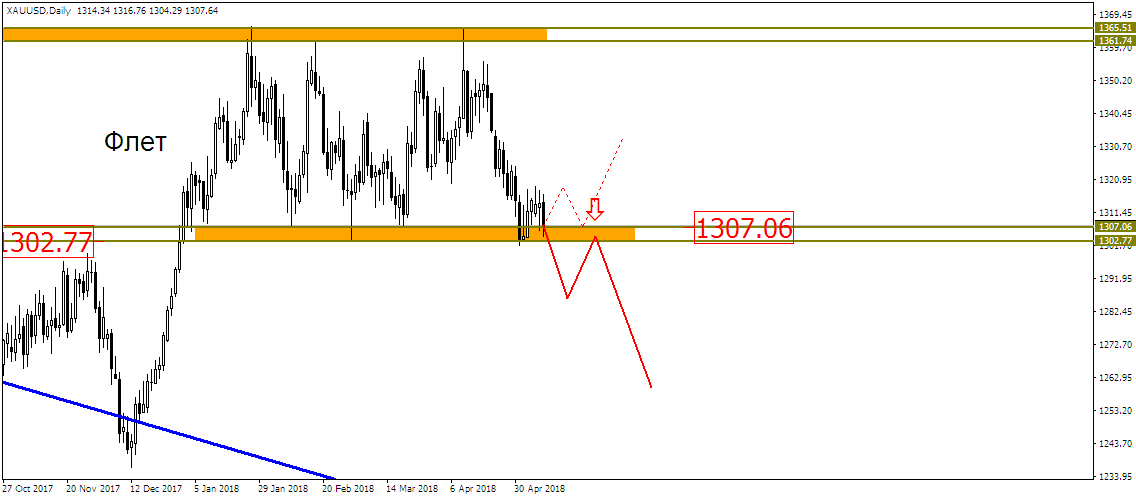 По золоту мы топчемся у нижней границы флета. Сейчас решается вопрос – пробитие или отскок. В принципе, смотря на укрепление доллара по другим фронтам, и неспособность золота развить уверенное восходящее движение, можно предположить и пробитие нижней стороны флета с последующим падением вниз. Кстати, вниз есть куда падать: