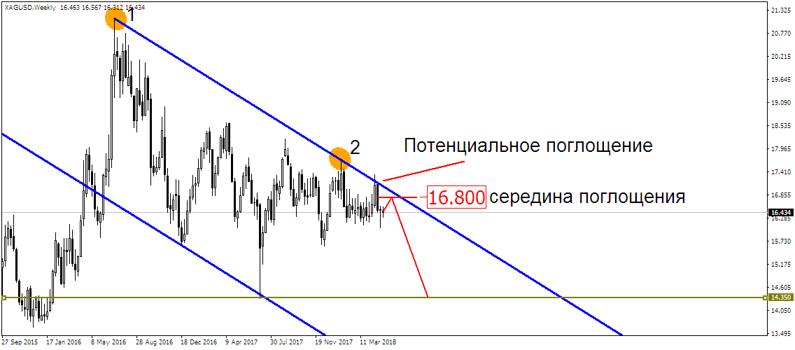 Серебро, на недельном графике, медвежьим поглощением уперлось в нисходящий канал, что сигнализирует о намерении металла пойти вниз. Конечно, здесь не стоит исключать возвращения цены к середине поглощения, а только затем падение: