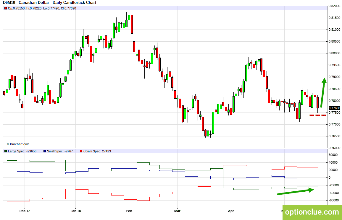 Индикатор COT укрепляется. Отчеты CFTC свидетельствуют о том, что крупные спекулянты покупают канадский доллар, хеджеры — продают, мнение профессионалов сочетается с технической картинкой рынка.