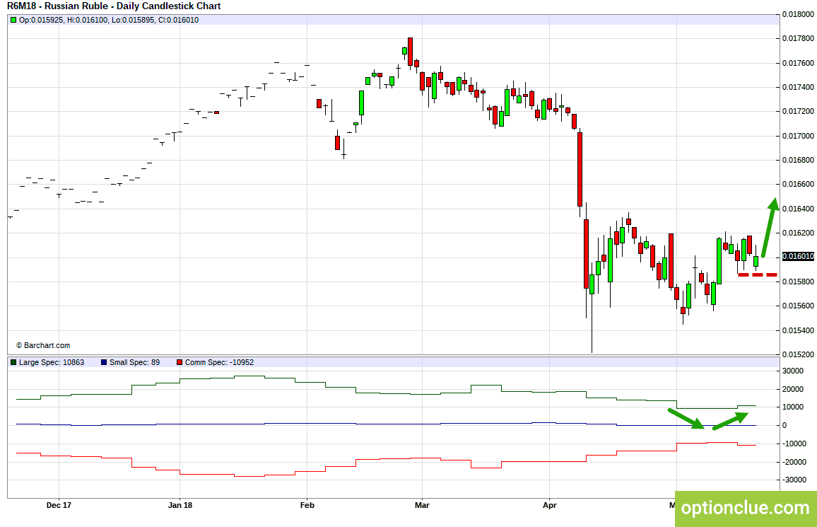 Индикатор СОТ развернулся, крупные спекулянты начали покупать рубль. Мнение профессионалов сочетается с направление тренда на дневном таймфрейме.