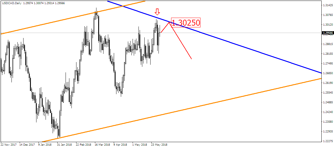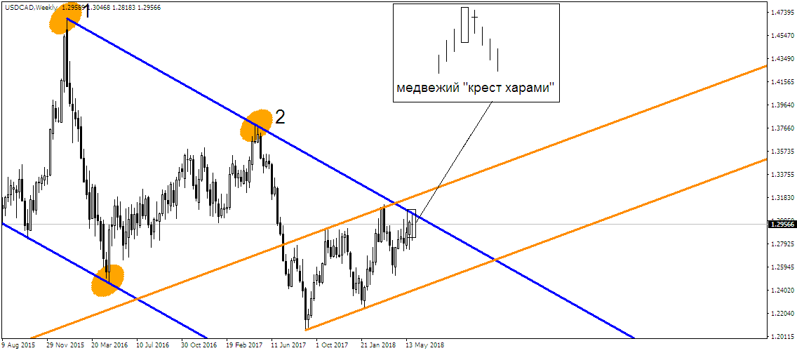 На недельном графике пары USD/CAD цена вплотную подошла к линии нисходящего канала и сформировала свечную разворотную модель медвежий крест харами, что сигнализирует о намерениях пары пойти вниз: