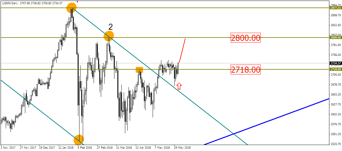 По индексу S&P500 цена продолжает который день "крутиться" над уровнем 2710. Цена несколько раз пыталась пробиться вниз, но попытки оказывались безуспешными. Наш базовый сценарий по индексу остается прежним – рост до уровня 2800: