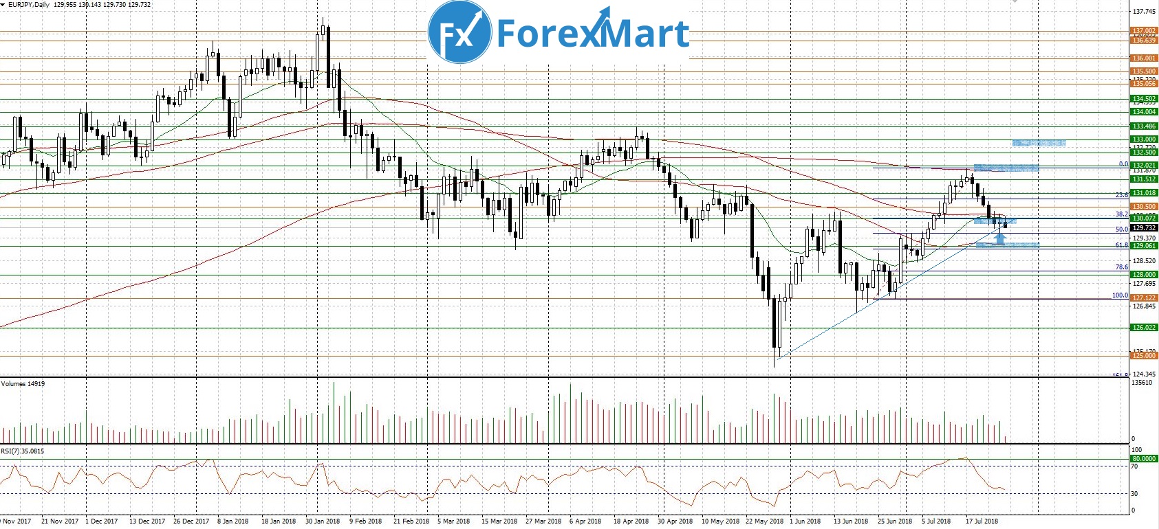 Валютная пара евро/японская йена сформировала на дневном графике свечной паттерн «доджи» под уровнем сопротивления 130.00, усиленном областью 38.2 Фибоначчи, трендовой линией и линией простой скользящей средней (SMA) за 100 дней.