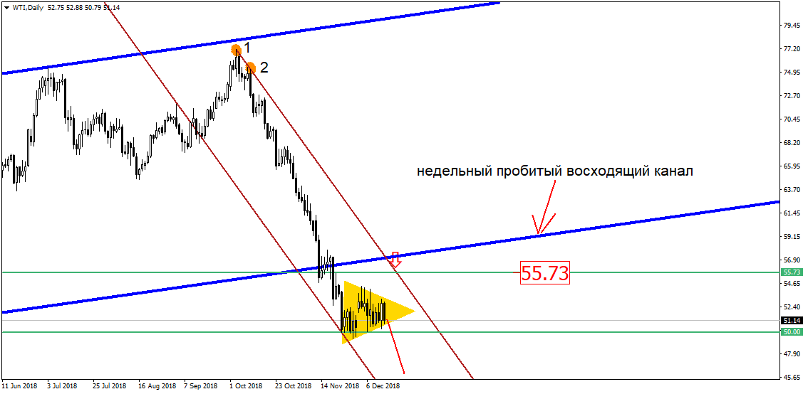 По нефти продолжаем формировать треугольник (на недельном графике у нас это вымпел), поэтому на следующей неделе стоит ждать выстрел вниз. В принципе, при реализации южного сценария цели могут быть довольно интересными: