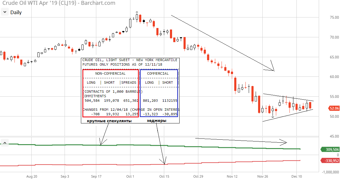 Отчеты COT CFTC показывают, что крупные спекулянты продолжают наращивать короткие позиции по нефти, тем самым давая косвенное подтверждение того, что треугольник разрешится вниз, то есть нефть продолжит свое падение: