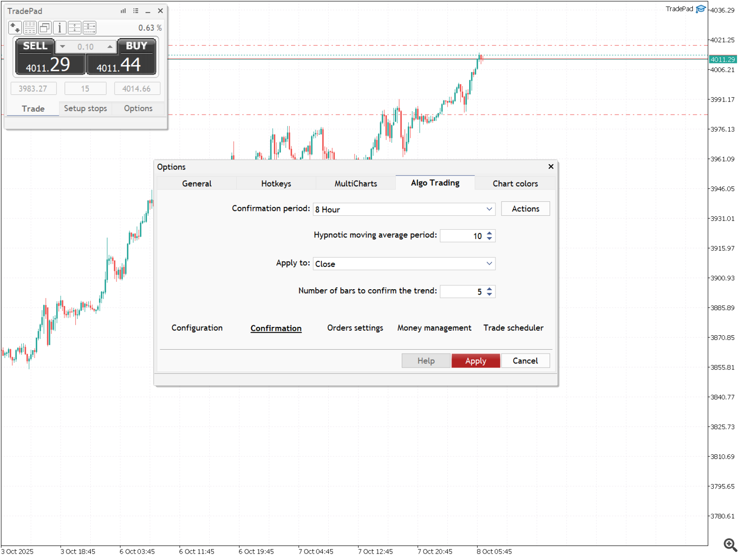 На этой вкладке вы можете настроить параметры алгоритмической торговли. Вкладка содержит дополнительные вкладки: "Configuration", "Confirmation", "Orders settings", "Money management" и "Trade scheduler".