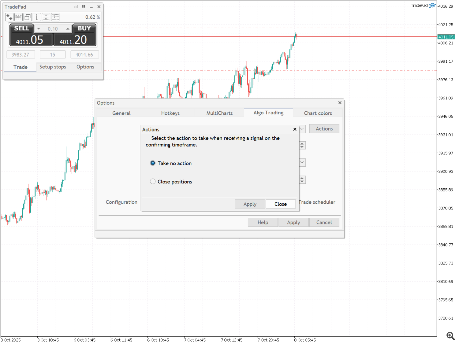 - Кнопка "Закрыть приложение" удаляет TradePad с графика.