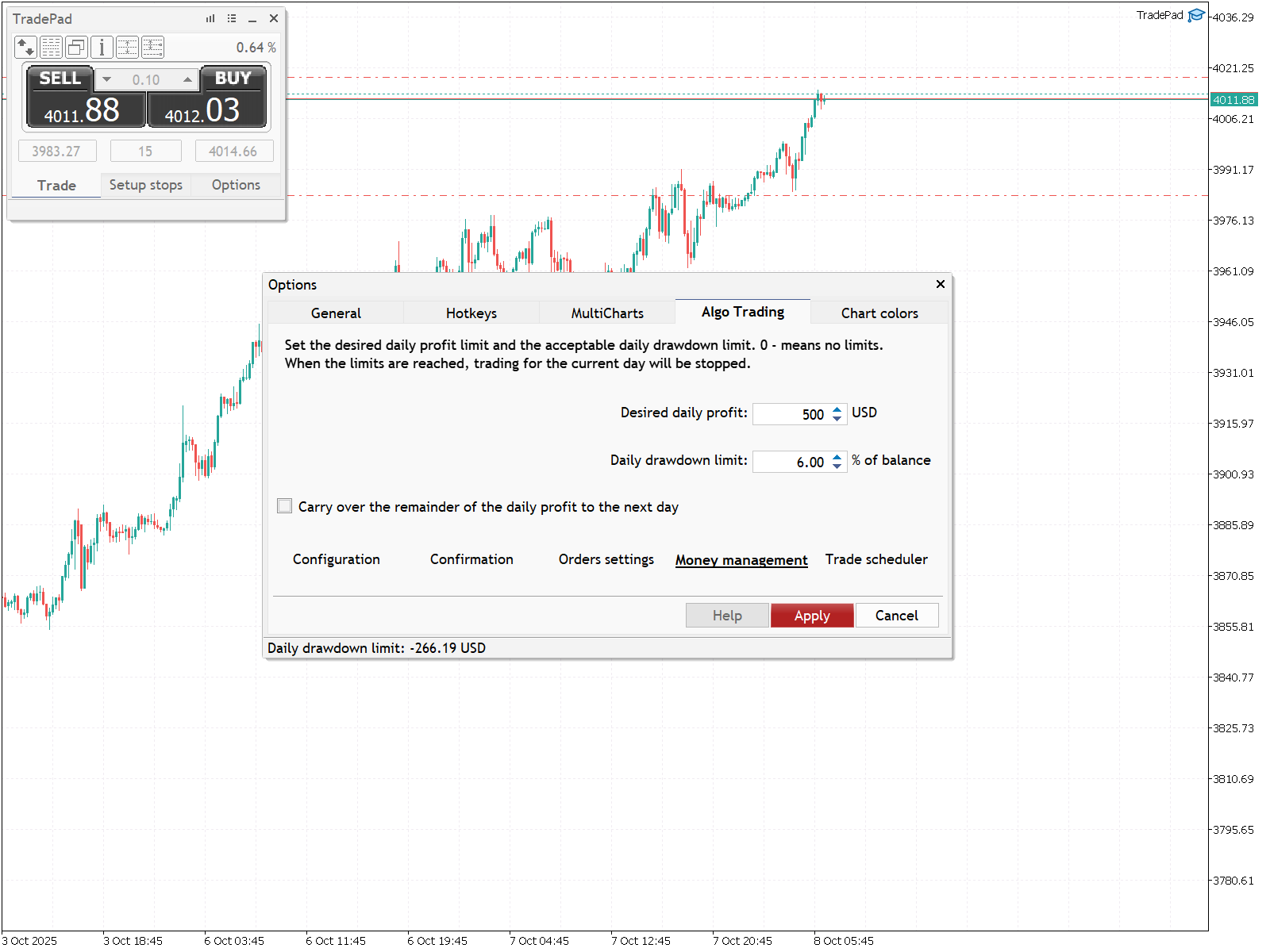 Например, если у вас есть открытые позиции, и их убыток достиг дневного лимита просадки, все позиции будут закрыты, а все отложенные ордера удалены. Алгоритмическая торговля будет приостановлена до следующего дня.
