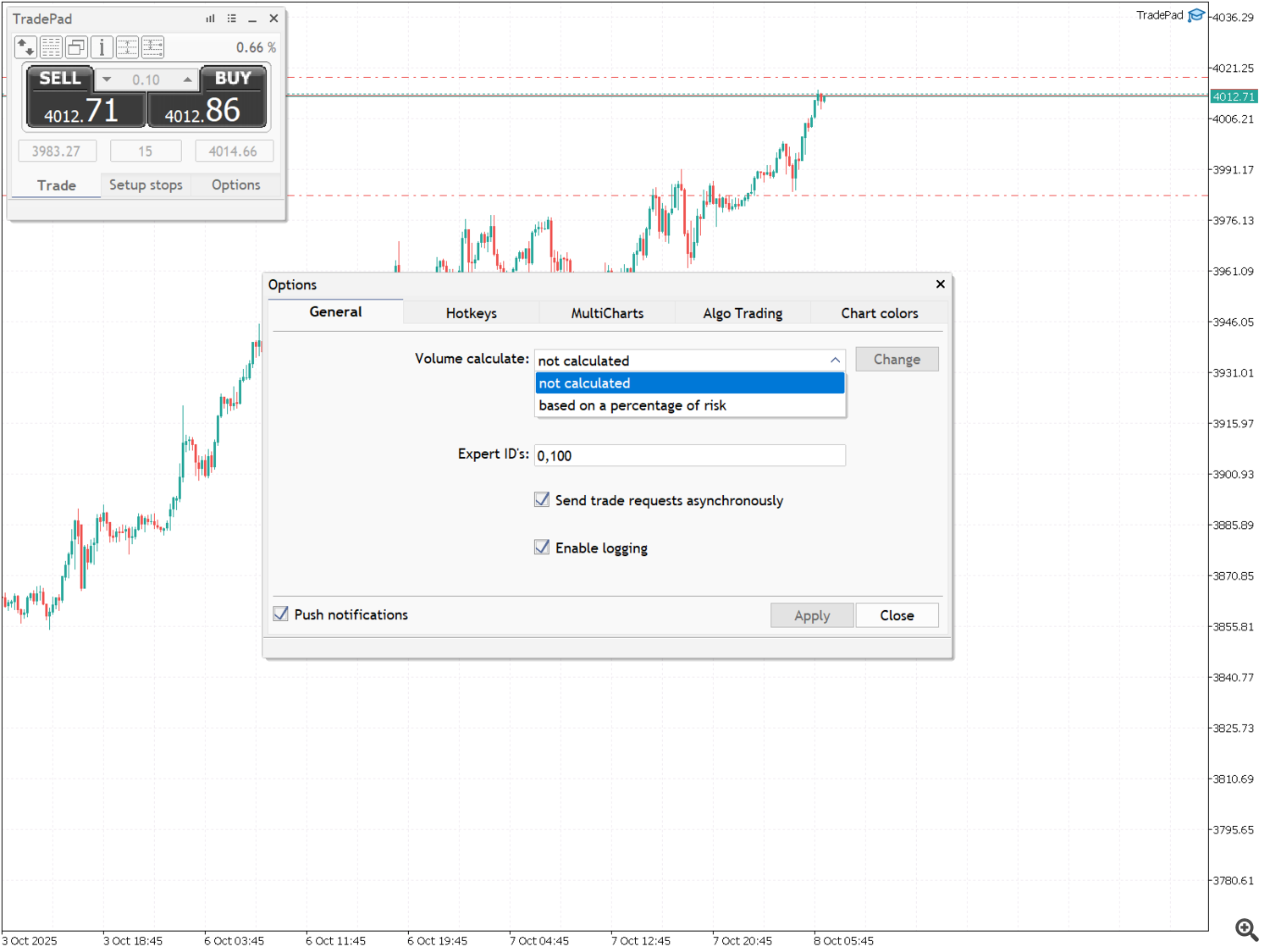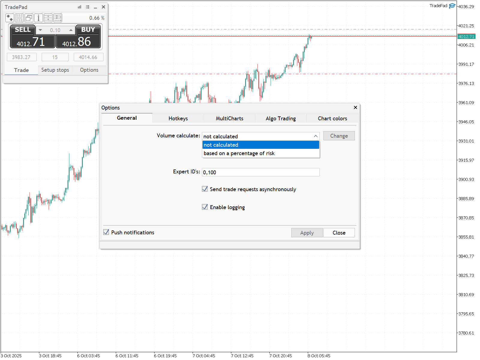 Следующий пункт - "Track all orders and positions" - включает/выключает отслеживание позиций и ордеров с разными идентификаторами. Если эта опция отключена, TradePad будет отслеживать только «свои» позиции и ордера с заданным ранее идентификатором (Главное окно -> вкладка "Options" -> Expert ID). Для отслеживания позиций и ордеров с разными идентификаторами включите переключатель "Track all orders and positions" и введите все идентификаторы через запятую в поле "Expert ID's". Для выполнения асинхронных торговых операций без ожидания ответа торгового сервера на отправленный запрос включите переключатель "Send trade requests asynchronously". В процессе работы TradePad генерируются различные сообщения. Для отображения этих сообщений в журнале "Experts" включите переключатель "Enable logging". Вы также можете задать процент риска для автоматического расчёта объёма лота при использовании инструмента разметки торговых уровней.