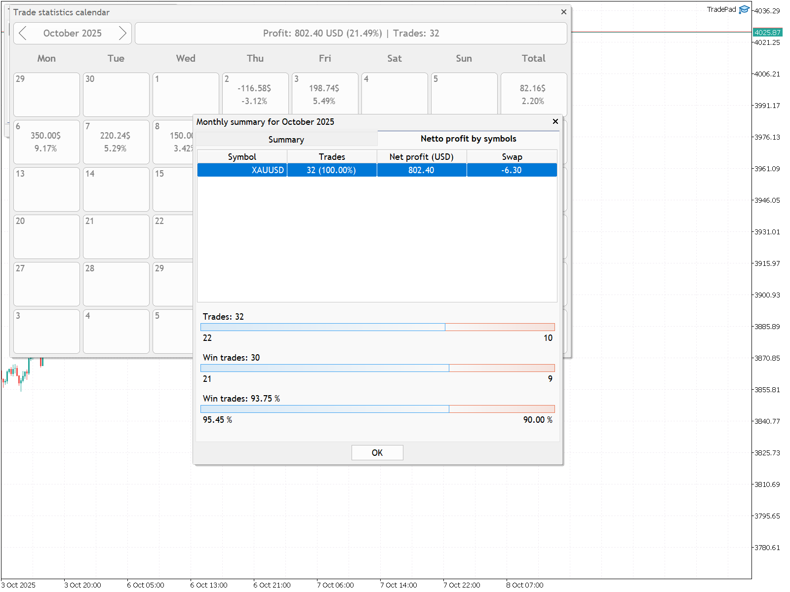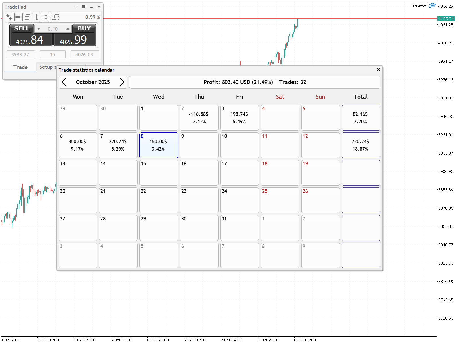 - Календарь торговой статистики для просмотра результатов торговли за день, неделю, месяц;