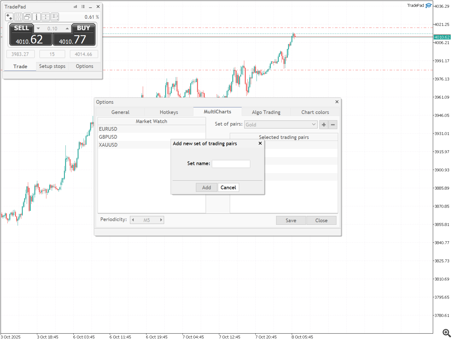 На этой вкладке создаются списки торговых пар для инструмента MultiCharts, которые вы отслеживаете и получаете торговые сигналы для алгоритмической торговли. Выберите из списка "Set of pairs" набор, в который хотите добавить торговую пару, затем выберите символ из списка "Market Watch", укажите желаемый временной период и добавьте его в список "Selected trading pairs" с помощью кнопки