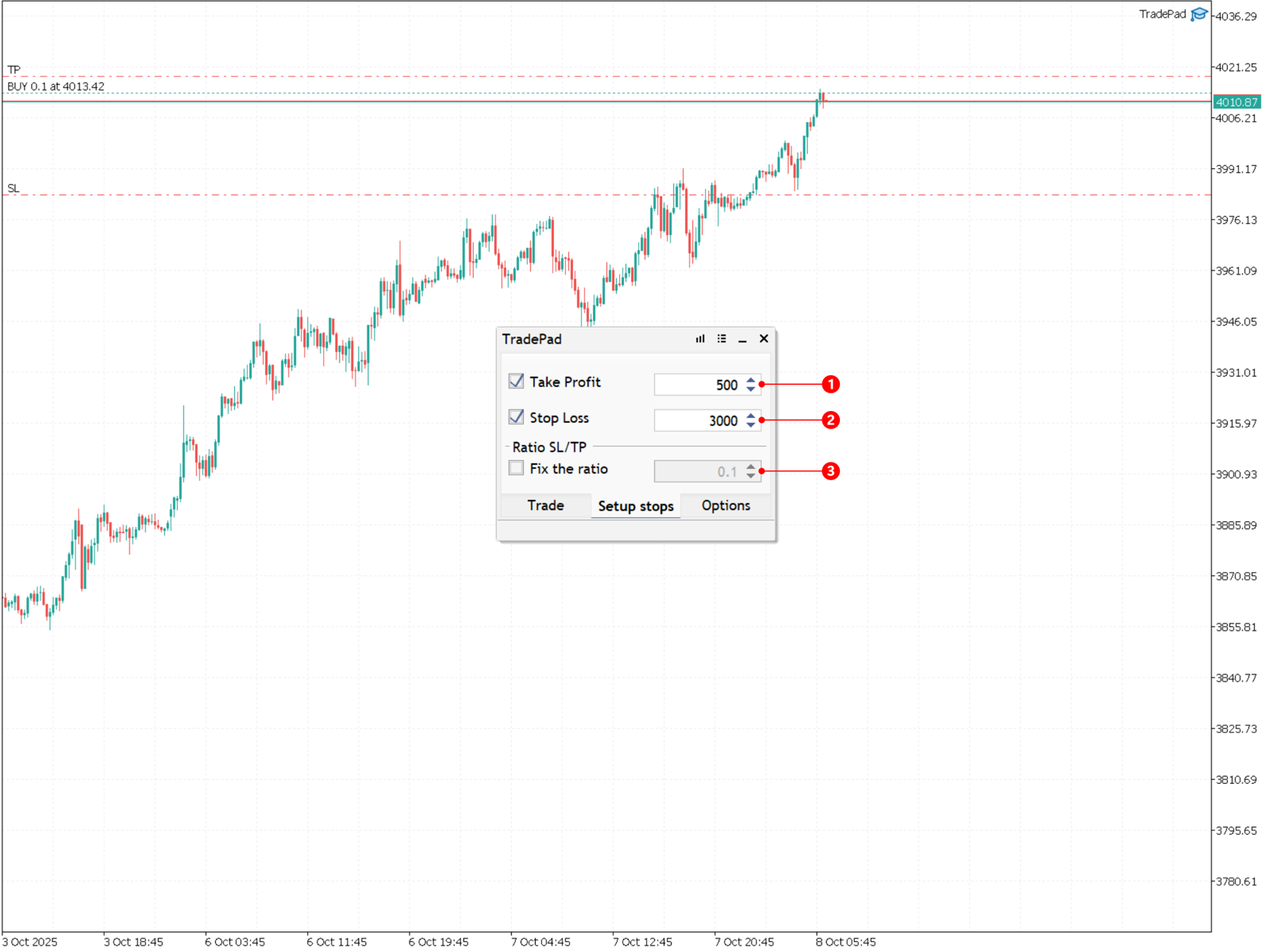На этой вкладке устанавливаются уровни Тейк Профит и Стоп Лосс в пунктах. Вы также можете указать соотношение уровней Стоп Лосс и Тейк Профит. Эти значения можно изменить с помощью стрелок справа от поля ввода или с помощью клавиатуры.