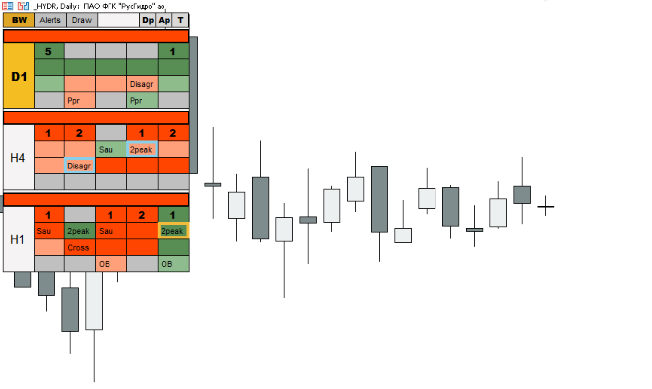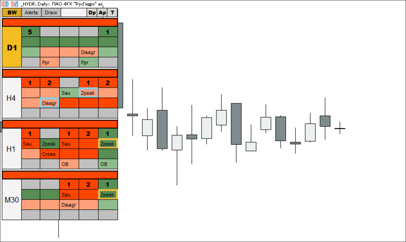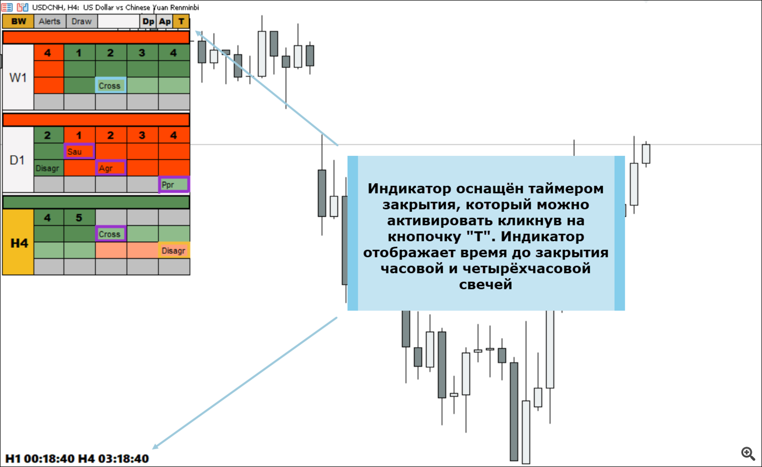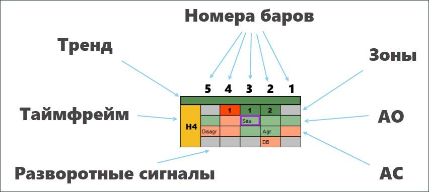 По умолчанию индикатор анализирует одновременно 4 таймфрейма. Таймфреймы располагаются снизу вверх от младшего к старшему. Таймфрейм на котором на текущий момент находится пользователь выделяется жёлтым.