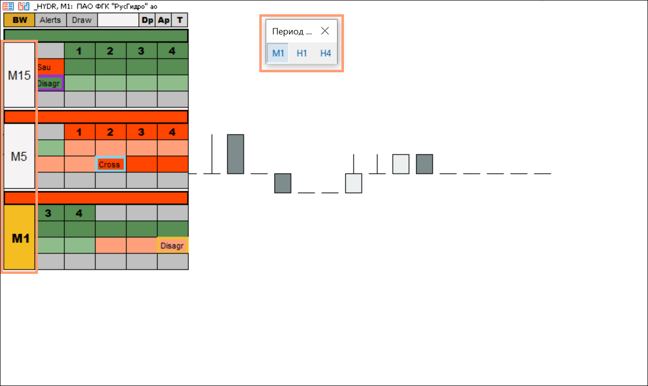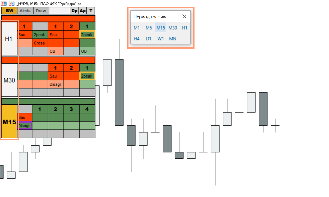 - Таймфрейм. Слева отображается таймфрейм. Если таймфрейм текущий - закрашивается жёлтым.