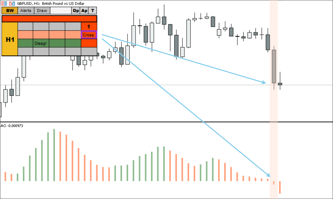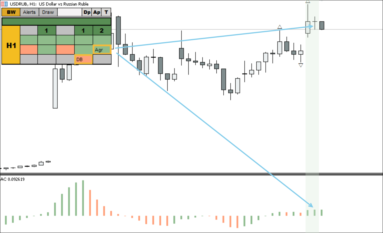 На примере ниже был сформирован сигнал на продажу "Продажа в несогласии с движущей силой" по AC. Минимум сигнального бара не был пробит, что значит, что сигнал не сработал. После этого направление AC изменилось на восходящее, что окончательно отменило сигнал. В такой ситуации обводка пропадает.