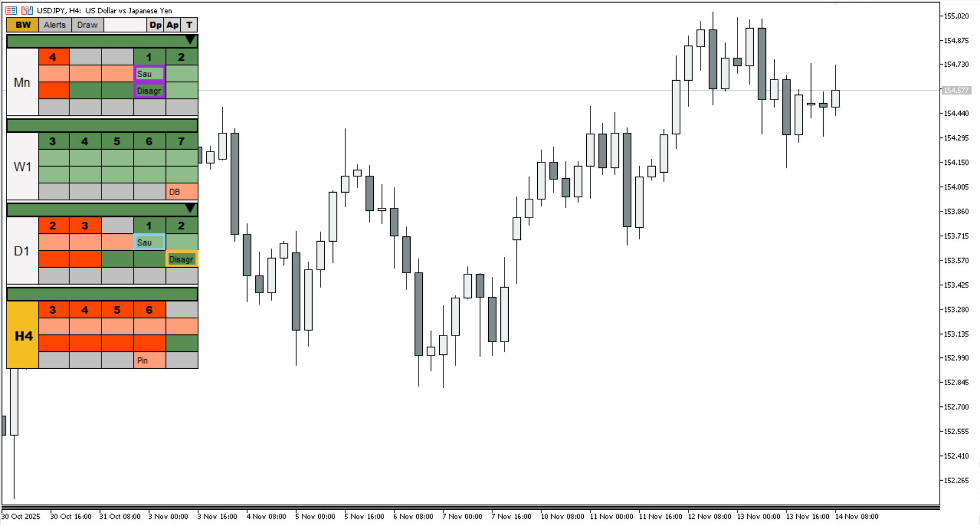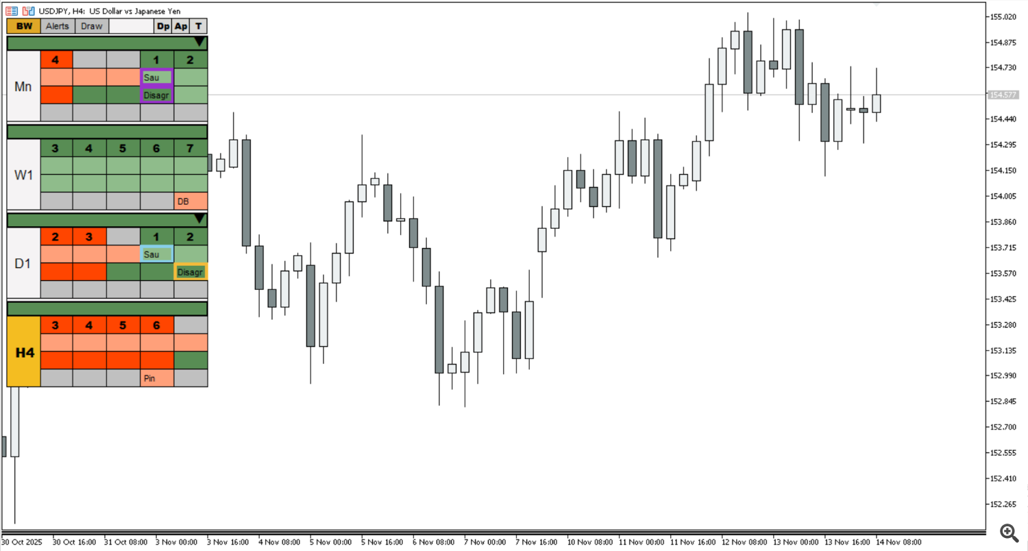 По умолчанию индикатор отображает таймфреймы на панели в порядке возрастания. Например, находясь на H4, мы увидим следующую картину: