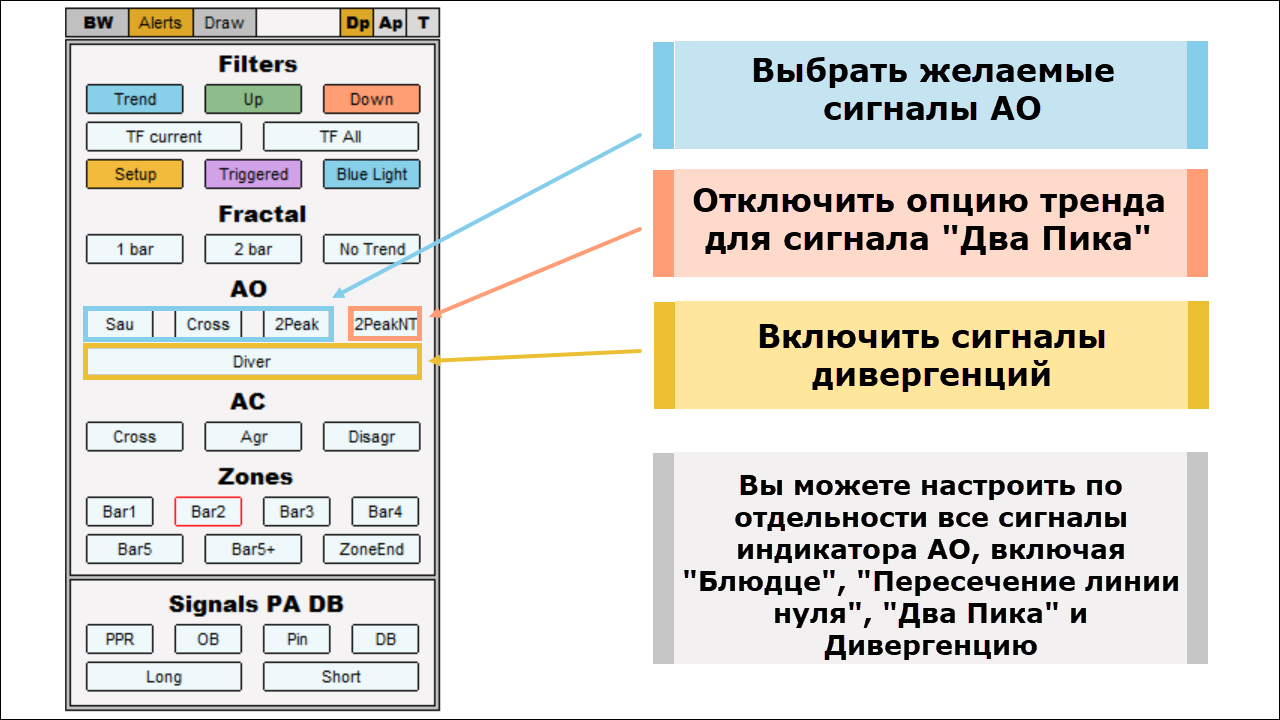 В рамках "Profitunity" существует три типа сигналов, которые даёт индикатор AO: