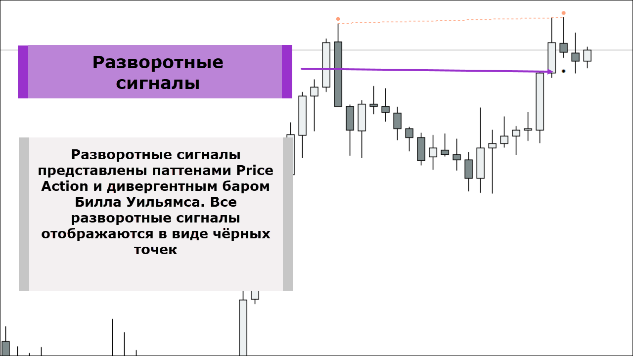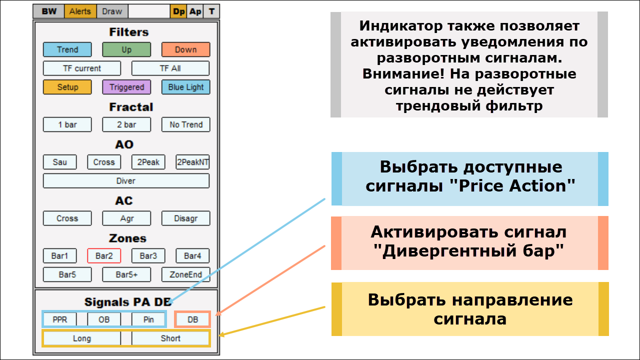 - 4 строка. Отображает разворотные сигналы. Среди них Пин бар, Внешний бар, PPR, Дивергентный бар.