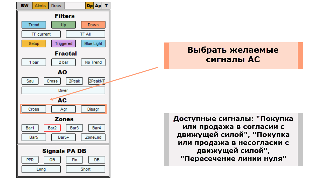 На примере ниже на индикаторе AC присутствует сигнал "Покупка в согласии с движущей силой" - "Agr" на панели индикатора.