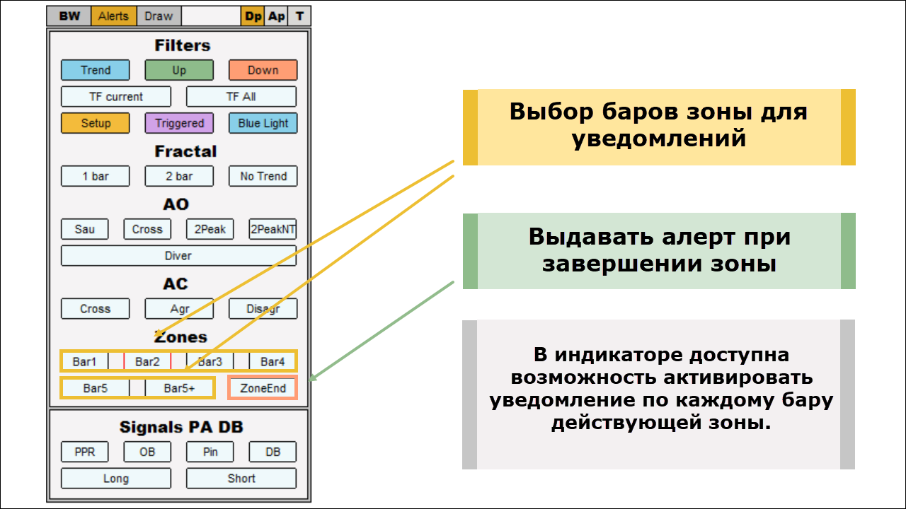 - Только с сигналами(With Signal) - отображать номера зон только на барах с сигналами АО и АС