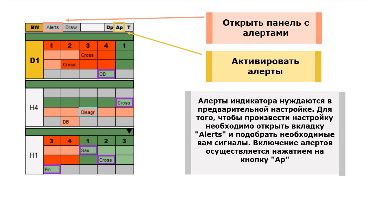 Все найденные сигналы индикатор отображает не только на панели в левой части графика, но и на самом графике. Предварительно отображение сигналов необходимо настроить. Для этого нажмите на кнопку "Draw" на панели индикатора.