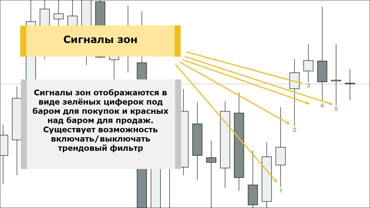 Продолжительность формирования зоны отмечается цифрами: 1 - первый бар зоны, 2 - второй бар зоны и т.д. Цифрами отмечаются только красные и зелёные зоны, серая зона(отсутствие тренда) никак не отмечается. На примере ниже индикатор указал на сильный восходящий тренд(зелёная зона продолжалась 4 бара подряд).