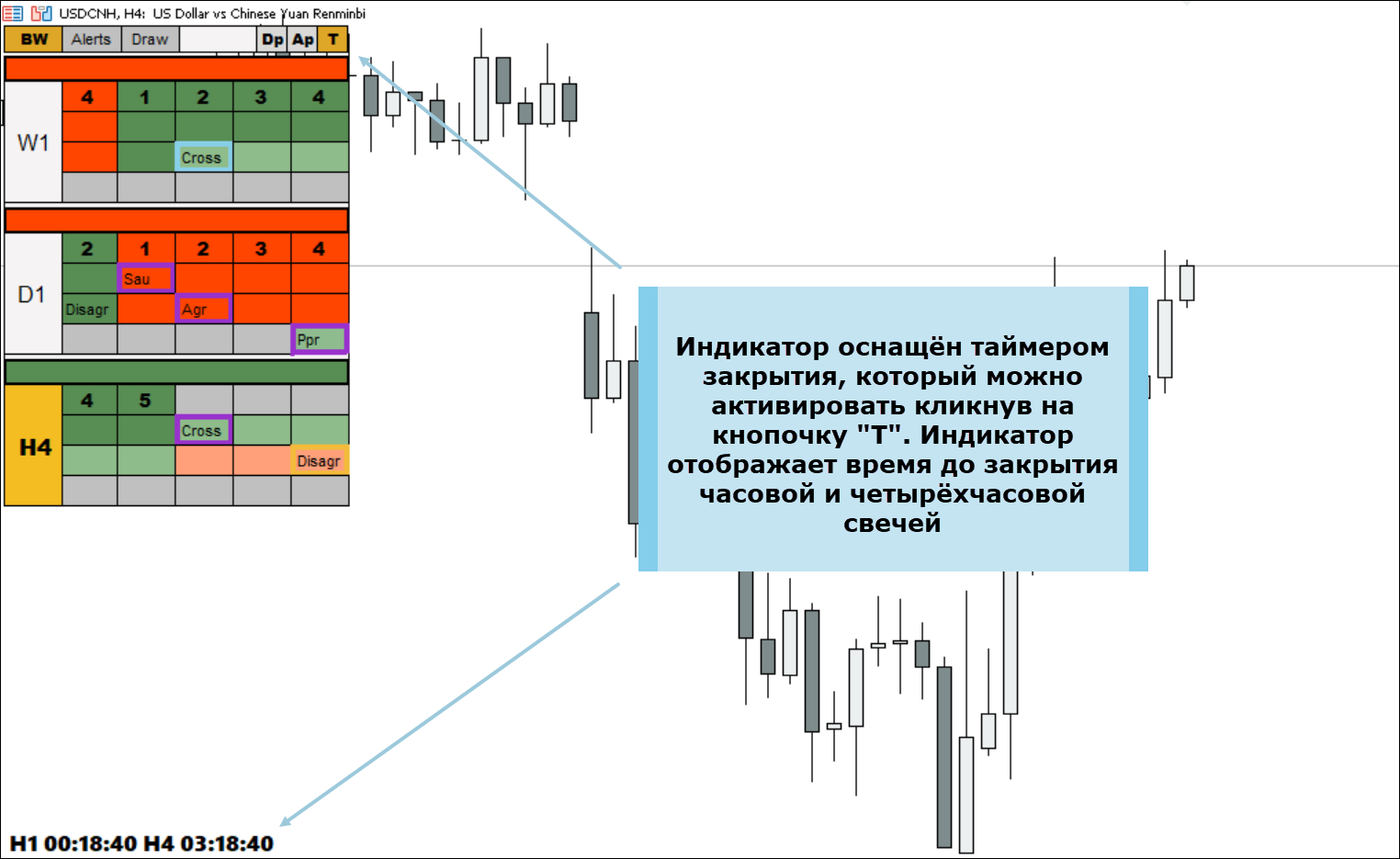 По умолчанию индикатор анализирует классические таймфреймы: m1, m5, m15, m30, H1, H4, D1, W1, Mn.