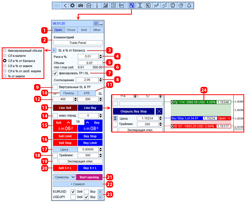- Открыть отложенные ордера и позиции с автоматическим расчетом риска.