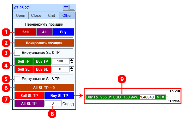 - Sell- панель закроет все позиции Sell и откроет одну позицию Buy с объемом, равным объему закрытых позиций Sell.