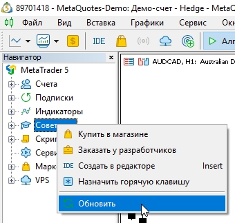 Обновите вкладку «Советники» в окне «Навигатор» (кликните правой кнопкой мыши по вкладке «Советники» и в контекстном меню выберите пункт «Обновить»).
