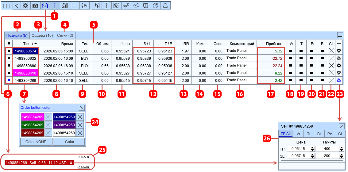 - Панель для выбора цвета кнопки и метки ордера или позиции.