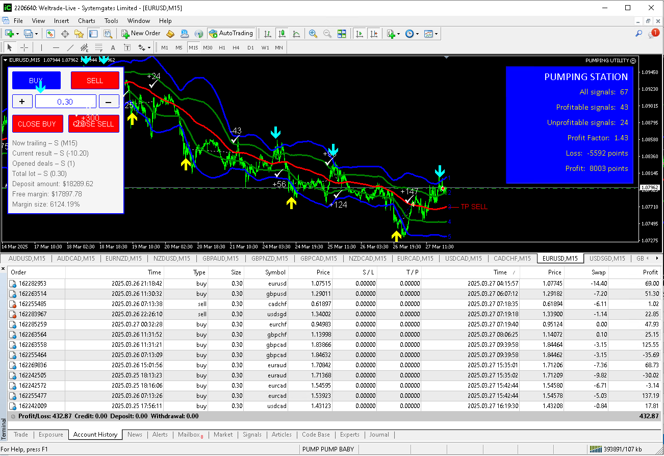 Это была отличная идея переложить почти всю работу - сопровождение сделок и фиксацию результатов на хрупкие плечи утилиты. Я получаю сигналы от индикатора (который установлен на VPS), легким движением руки открываю сделку на мобильном терминале и больше не смотрю, что происходит на рынке. Моя утилита управляет сделками вместо меня. И почти по всем сделкам приносит прибыль. Вот, к примеру результаты торговли только за сегодняшний день (+432 USD):