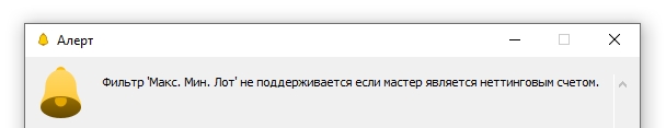 | Вы пытаетесь включить фильтр 'Макс. Мин. Лот' при копировании с неттинг-счета. Trade Copier не поддерживает фильтр 'Макс. Мин. Лот' если Master является неттинг-счетом. |
