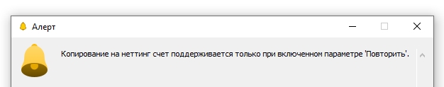 | Вы пытаетесь отключить параметре 'Повторить' на неттинг-счете. Trade Copier не поддерживает работу с отключенным параметром 'Повторить'. если Slave является неттинг-счетом. |