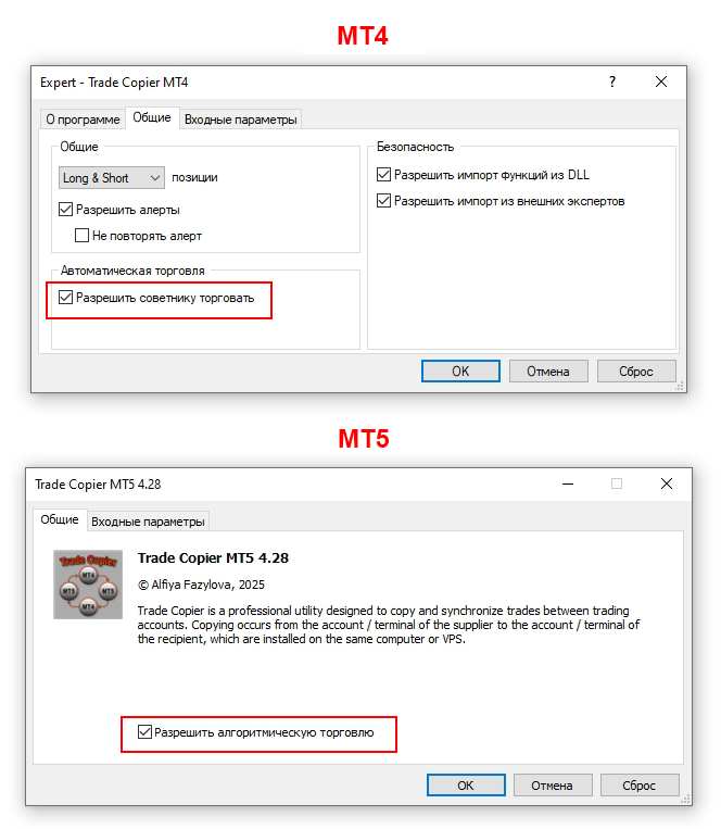 | Для Trade Copier выключена авто-торговля. Для того чтобы Trade Copier смог выполнять торговые операции вам нужно разрешить авто-торговлю для копировальщика. Для этого в окне настроек копировальщика перейдите на вкладку "Общие" и установите галочку "Разрешить советнику торговать" для мт4, или "Разрешить алгоритмическую торговлю" для мт5. |