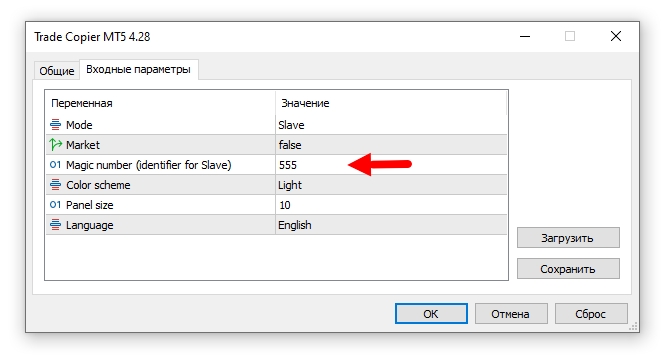 - Остановите копирование на старом Slave, нажав на ее панели кнопку Стоп. Запустите на новом терминале копировальщик в режиме Slave с теми же входными параметрами, что и на Slave со старого терминала (Magic number на старом Slave и на новом Slave должны совпадать). Убедитесь что новый Slave принял нужные настройки, и список копируемых символов. На вкладке Торговля должны отображаться все ордера и позиции, которые в рынке.